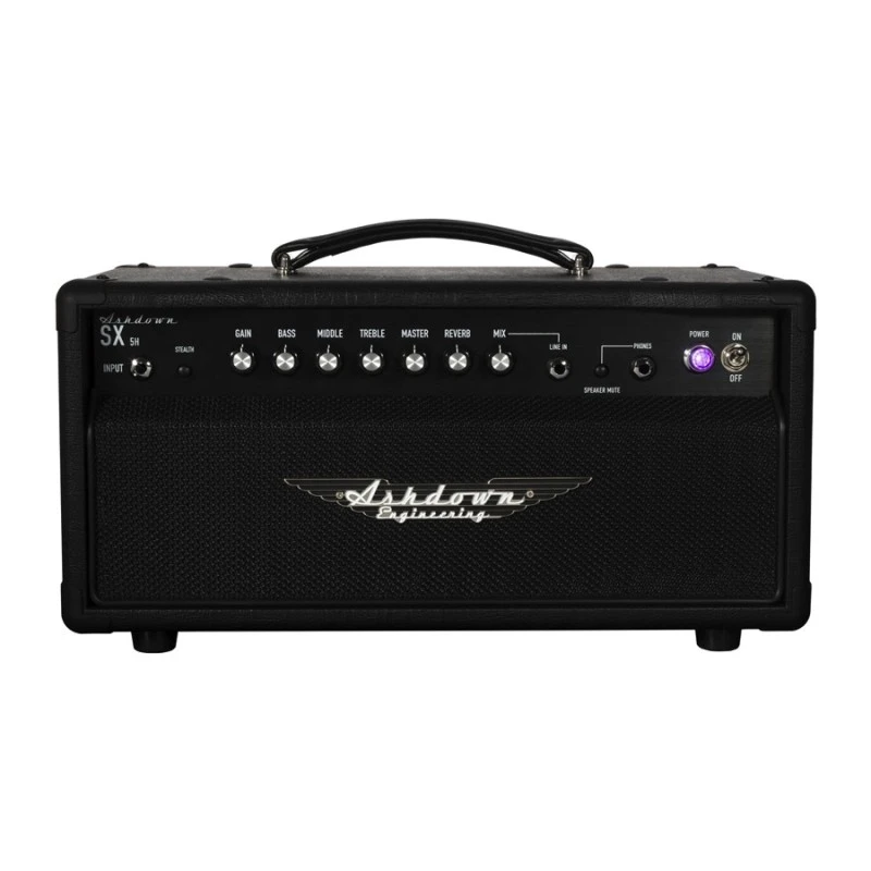 La nuova linea SX di Ashdown offre amplificatori per chitarra moderni e versatili, adatti sia per lo studio, sia per sessioni di registrazione o live. Questi amplificatori valvolari aggiungono caratteristiche moderne a un timbro classico. La testata SX-5H ha una potenza di 5 watt ed è alimentata da una valvola ECC83 e una EL84. Questa combinazione fornisce un suono ricco, caldo e dinamico. Questo amplificatore monocanale è dotato di un riverbero digitale, di un loop effetti seriale e di un’uscita con simulazione di cabinet per registrare direttamente. Lo switch Stealth riduce il volume complessivo attivando una compensazione del tono dello speaker per un’utilizzo in studio. La funzione speaker mute attiva l’uscita cuffie, grazie alla quale è possibile suonare silenziosamente. L’ingresso AUX permette di mandare basi o tracce audio. L’uscita Record Out con simulatore di cassa consente di registrare direttamente il suono valvolare dell’amplificatore. È possibile collegare cabinet aggiuntivi con le uscite da 16 e 8 Ohm.
