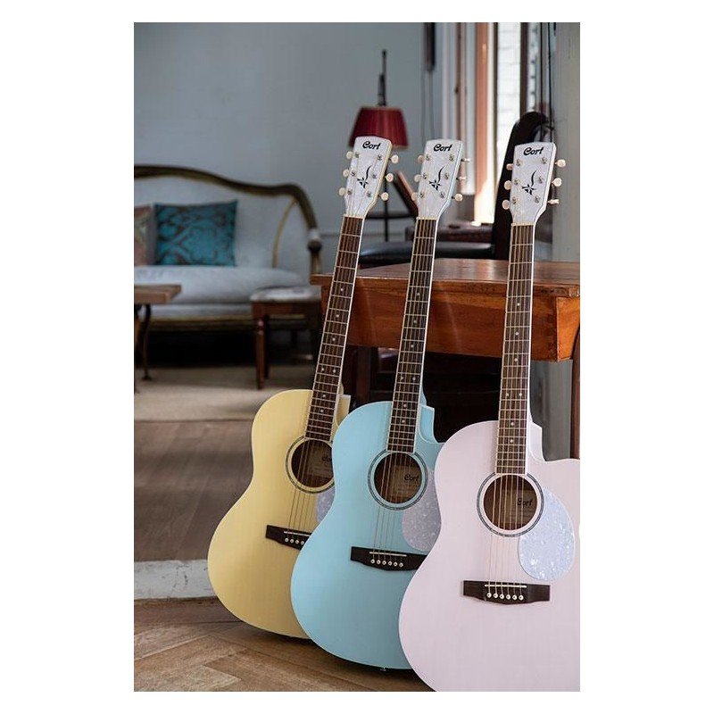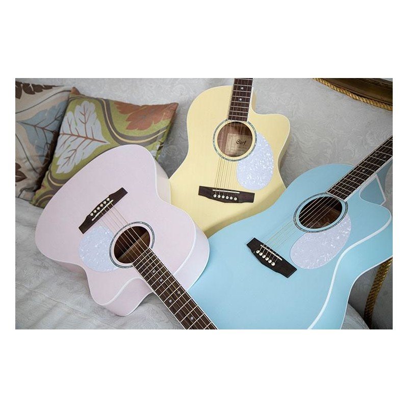Cort Jade Classic Pastel Pink Open Pore è una chitarra acustica con fondo, fasce e top in mogano laminato, manico in mogano, tastiera in Laurel e sistema di elettronica Cort CE304T.