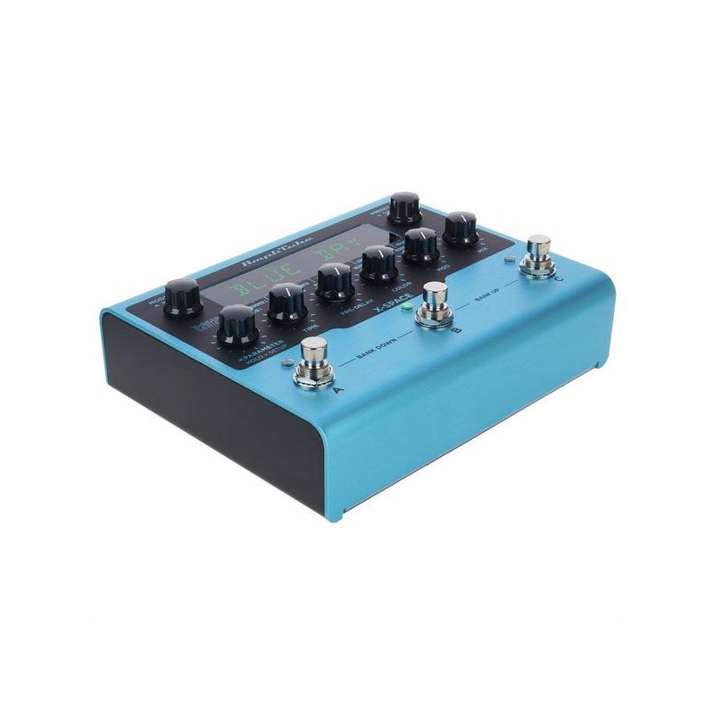 IK Multimedia X-space è un pedale per riverbero per strumenti color blu, con chassis in alluminio.