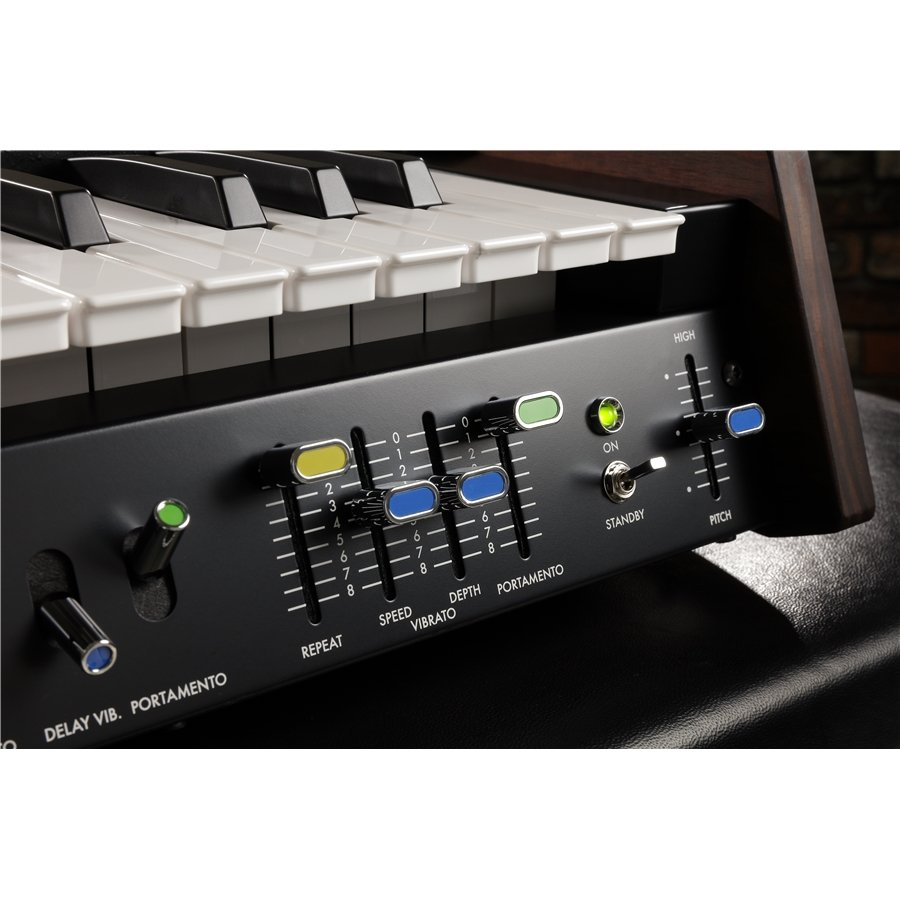 Nel primo prototipo, il pannello di controllo alla sinistra della tastiera era equipaggiato con un Traveler dalla corsa molto lunga e dalla speciale struttura. Nell’illustrazione vicina al Traveler potete vedere un joystick per il pitch bend, dei pulsanti di commutazione per le vocali A, I, U, E e O, e alcune lettere per il "Reverb" nella colonna sopra introdotte successivamente. Nel modello che abbiamo riproposto ritroviamo il joystick e il riverbero che vennero abbandonati nel 700s per questioni di riduzione degli spazi.