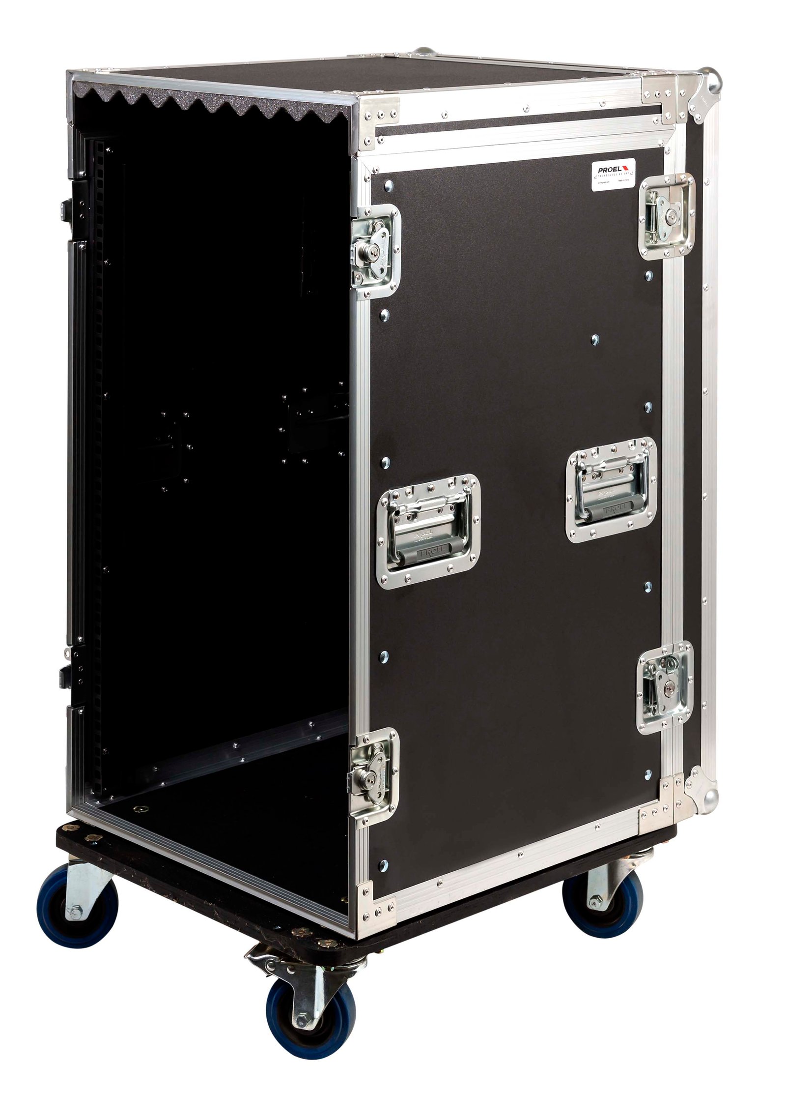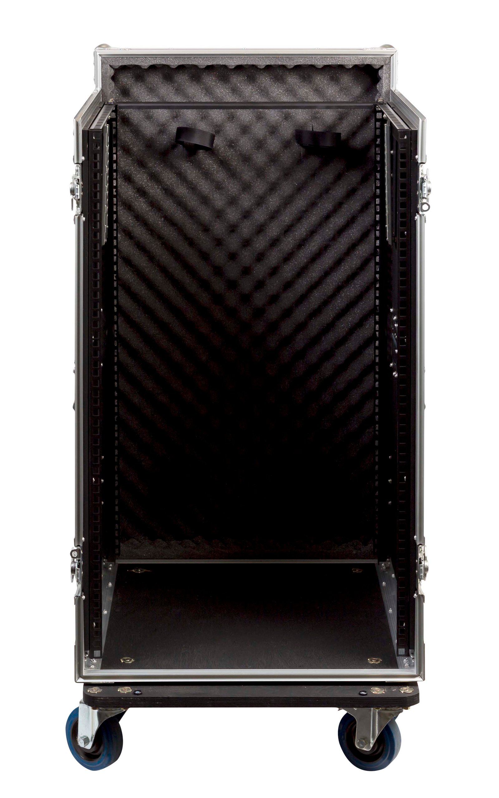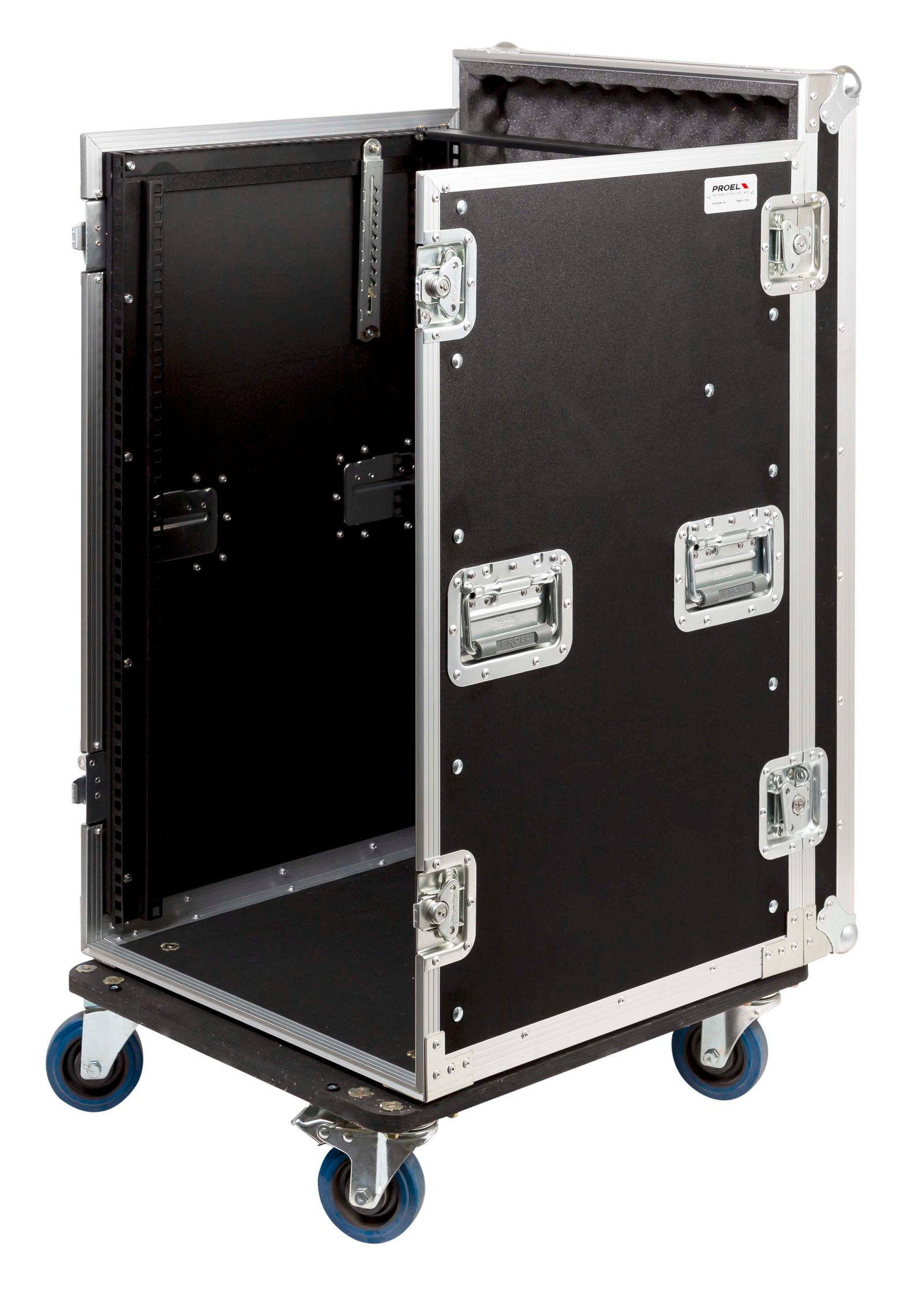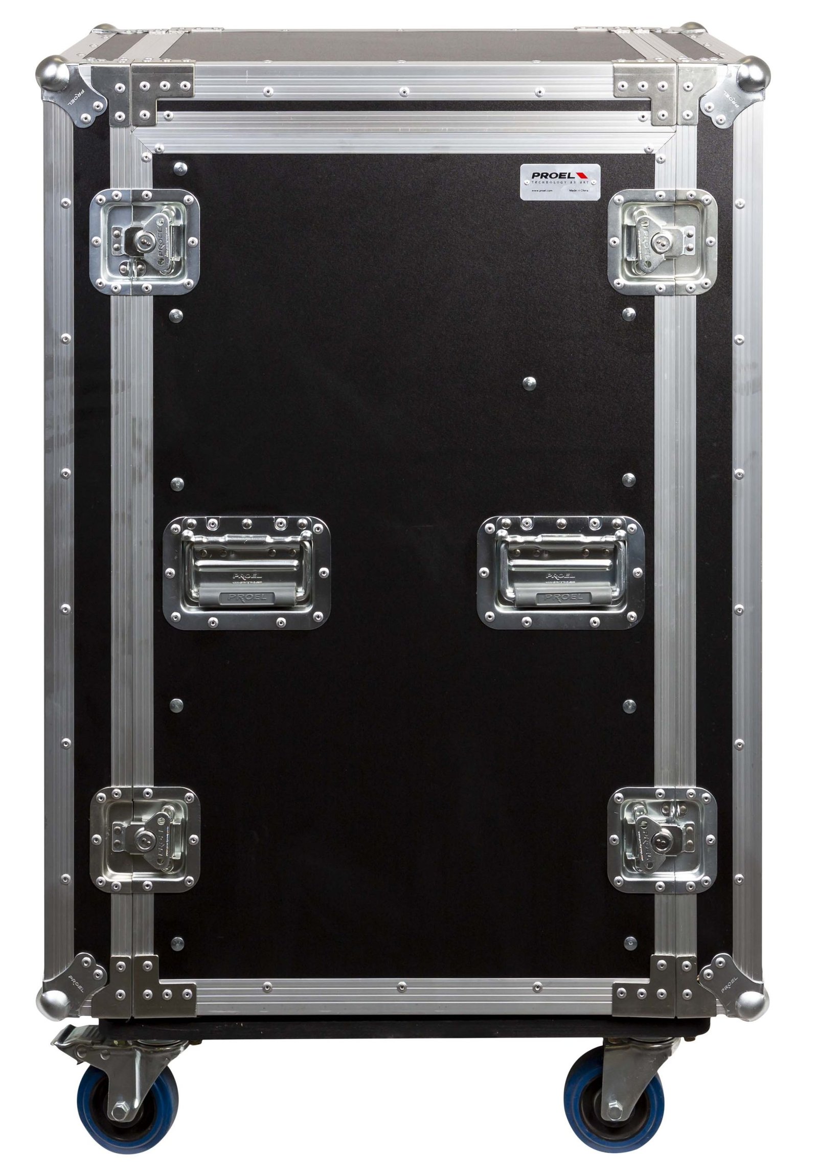 Custodie combo 19′ con portamixer 10u regolabile in altezza ï realizzate in multistrato di pino marino a 5 strati ad incollaggio fenolico, di spessore 9 mm. rivestimento in laminato plastico nero antigraffio. interno verniciato nero. dotate di chiusure a farfalla ad incasso in acciaio zincato con predisposizione per lucchetto, maniglie ad incasso in acciaio zincato con impugnatura in gomma nera e ritorno a molla, angolari e rinforzi in acciaio zincato, profi li in alluminio anodizzato e piedini industriali in gomma. barra rack doppia anteriore e posteriore con dotazione completa di viti, rondelle e dadi ingabbiati. Profondità utile corpo 45 cm. Ruote girevoli da 100 mm di tipo industriale (2 con freno).