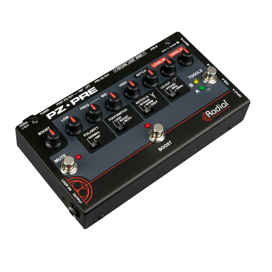 Il Radial PZ-Pre è un potente preamplificatore a 2 canali per strumenti acustici. Le alte prestazioni dei booster piezoelettrici PZB di classe A discreti al 100% conferiscono al preamplificatore tutta la sua qualità sonora, in più un circuito di pre-amplificazione ultra silenzioso si adatterà a qualsiasi sistema di pickup. Il PZ-Pre è dotato di due ingressi per rapidi cambi di strumento sul palco o per miscelare due pickup insieme. Un potente equalizzatore semi-parametrico consente all'utente di mettere a punto il proprio suono eliminando le frequenze fastidiose. Grazie alle uscite direct box pre e post EQ, il PZ-Pre può essere utilizzato per inviare un segnale dry a banco e un suono personalizzato ai monitor.