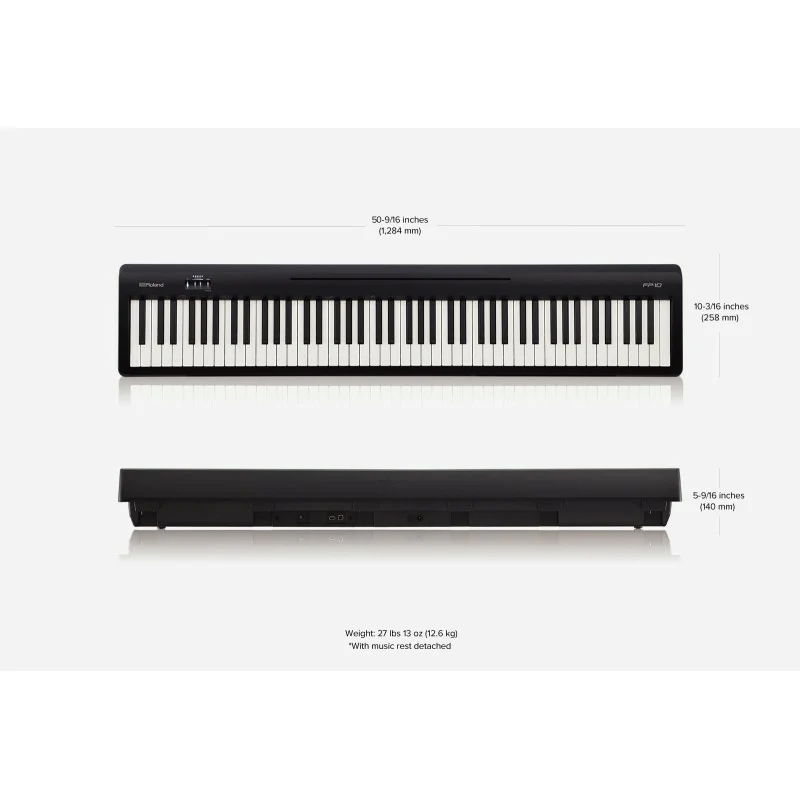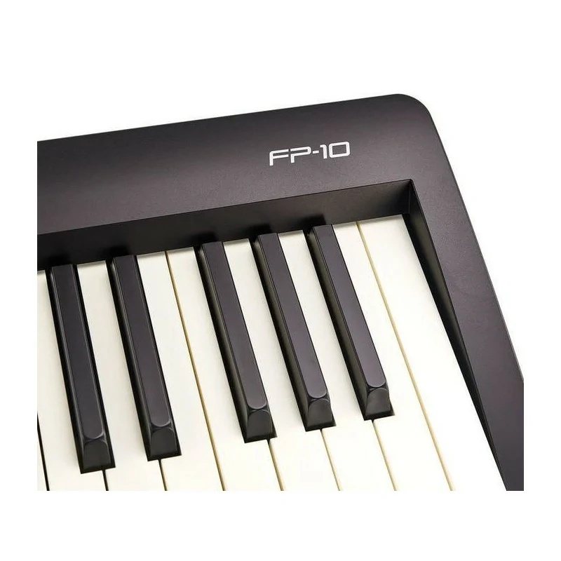 Roland FP-10 BK è un pianoforte digitale compatto con 88 tasti pesati di colore nero, con ingresso USB e funzioni base per lo studio avanzato e amatoriale, include leggio porta spartiti, pedale sustain e alimentatore di corrente.