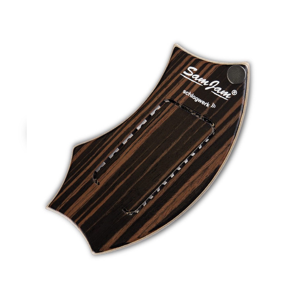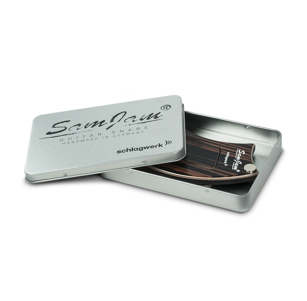 SJ 110 è un rullante snare per chitarra acustica, disponibile in 3 diverse colorazioni: Hard Coal Stripes, Makassar e Zebrano. Sam Jam 110 è la perfetta aggiunta groove per la tua chitarra. Con Sam Jam – The Guitar Snare trasformi la tua chitarra in uno strumento ritmico con il suono snare orientato al suono del cajón Schlagwerk. Sam Jam – The Guitar Snare fa uso del corpo di risonanza di una chitarra per sviluppare pienamente il sound snare. Per adattarsi in modo ottimale ai diversi corpi di risonanza delle chitarre e alle loro caratteristiche individuali di suono e di vibrazione e anche per evitare fastidiose vibrazioni viene impiegata la Snare Buzz Control Magnet. Particolare attenzione è stata data al fissaggio: Sam Jam – The Guitar Snare viene fissato con l’aiuto di un materiale adesivo ottenuto da materie prime naturali con il quale Sam Jam – The Guitar Snare può essere rimosso dalla chitarra facilmente e senza lasciare tracce.